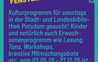 Die Zusammenarbeit von KulturMachtPotsdam und der Stadt- und Landesbibliothek in Potsdam geht weiter! Von Mai bis Juni haben wir bereits Termine. Die restliche Zeit des Jahres werden wir später verteilen. Deshalb gebt bitte an, ob ihr auch zu einem späteren Zeitpunkt im Jahr zur Verfügung steht.
