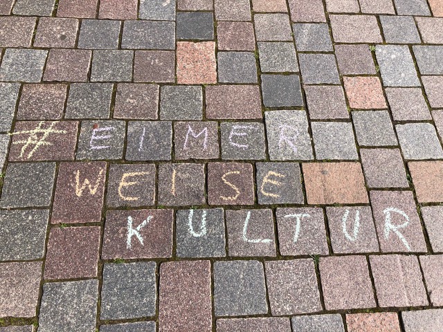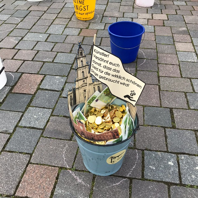 Auf diese Weise entsteht bewusst keine Installation, die Menschen zum Stehenbleiben animiert. Vielmehr generiert sie gerade durch ihre Deplatziertheit in der historischen Mitte eine besondere Aufmerksamkeit für das gemeinsame Anliegen. Begleitend können die mit den Kunstschaffenden solidarischen Teilnehmer:innen Fotos von sich beim Eimerabstellen in den sozialen Medien posten – unter den Hashtags #EimerweiseKunst und #KunstimEimer sowie gerne verbunden mit einer individuellen kulturpolitischen Forderung.