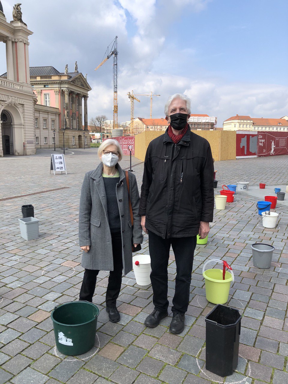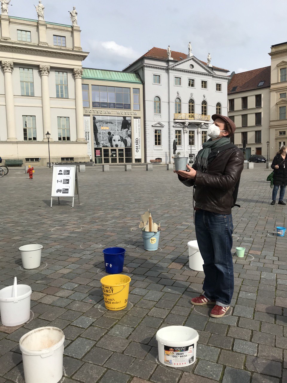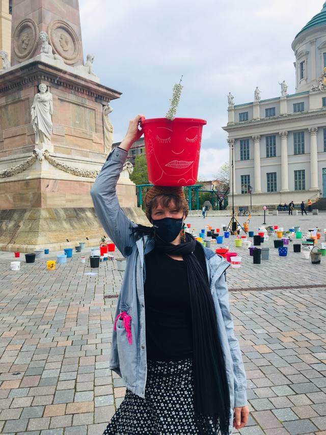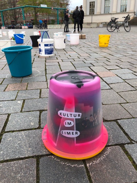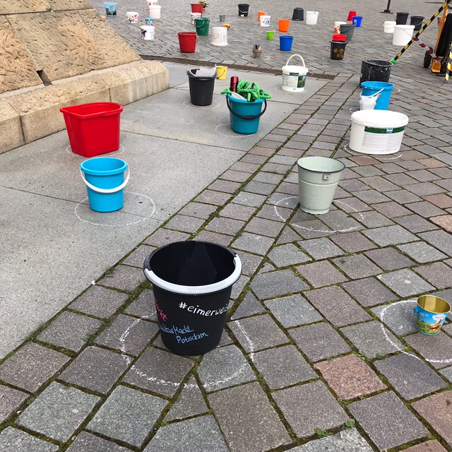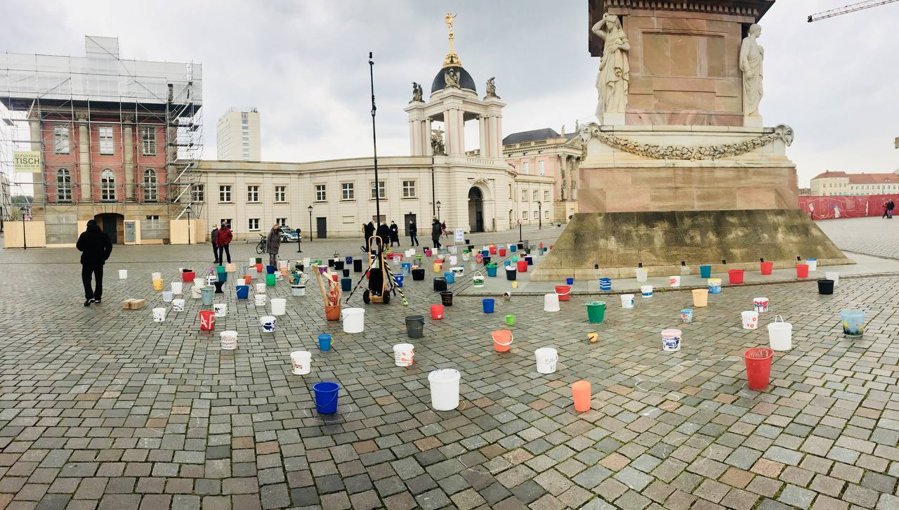 Wir laden daher am 1. Mai zwischen 09:00 und 16:00 Uhr Potsdamerinnen und Potsdamer zu einer „demonstrativen“ Aktion am Alten Markt ein. Nach dem Motto #EimerweiseKunst, werden Künstler:innen und alle Menschen, die ein Zeichen der Solidarität setzen wollen, aktiv, indem sie je einen Eimer zum Alten Markt bringen, diesen in einem wachsenden Kreis um den Obelisken aufstellen und dann wieder gehen.