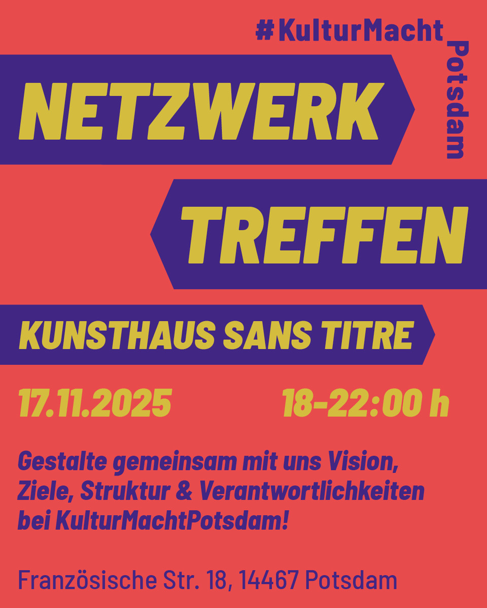 Meldet Euch an unter kommunikation@kulturmachtpotsdam.de damit ihr auch garantiert einen Sitzplatz bekommt!
